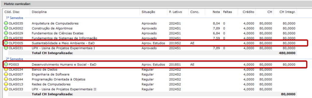 As disciplinas eliminadas estarão apontadas como Aproveitamento de Estudos.