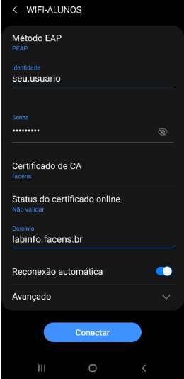 5 – Após instalar o certificado, acesse a rede WIFI-ALUNOS completando as
