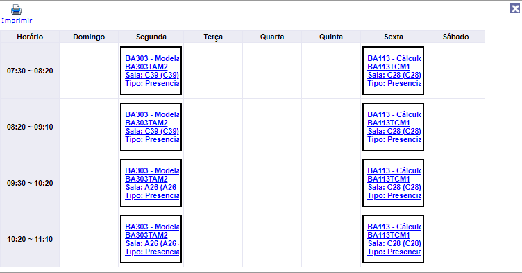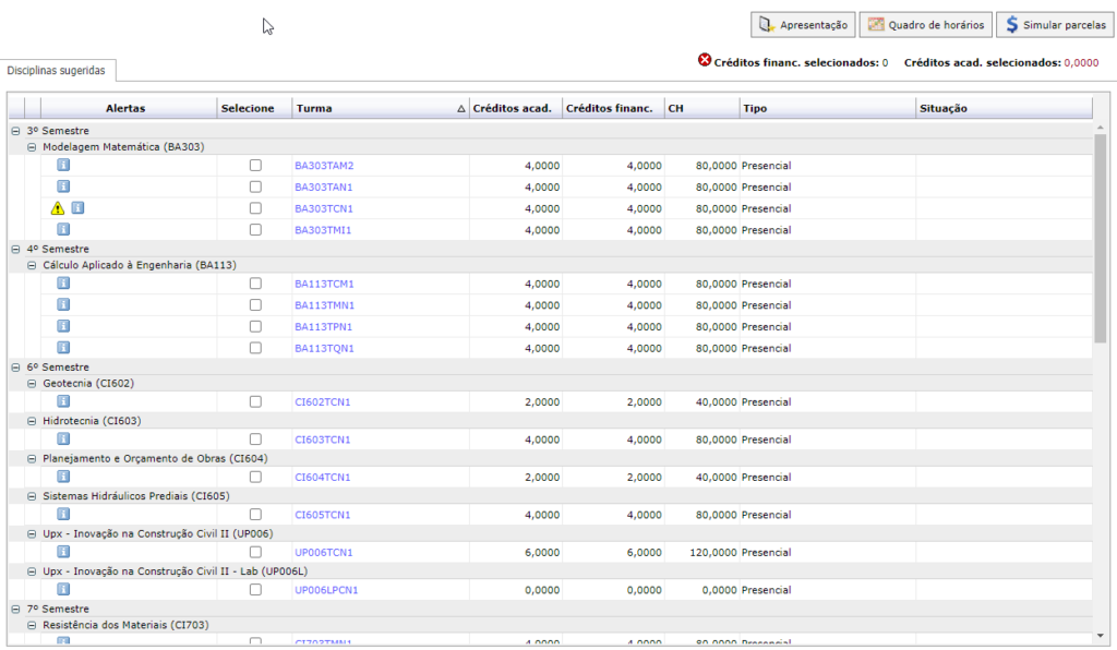 Quadro de Horários: Verificar o horário montado provisóriamente de acordo com as matérias selecionadas.