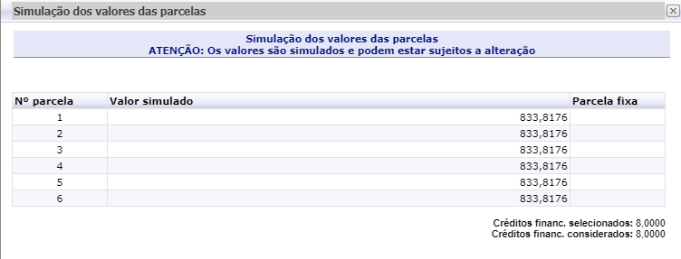 Simular Parcelas: Simulação de valores do semestre de acordo com as disciplinas selecionadas.