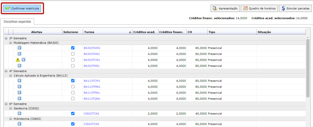 Após selecionar as disciplinas desejadas, clique no botão Confirmar Matrícula.