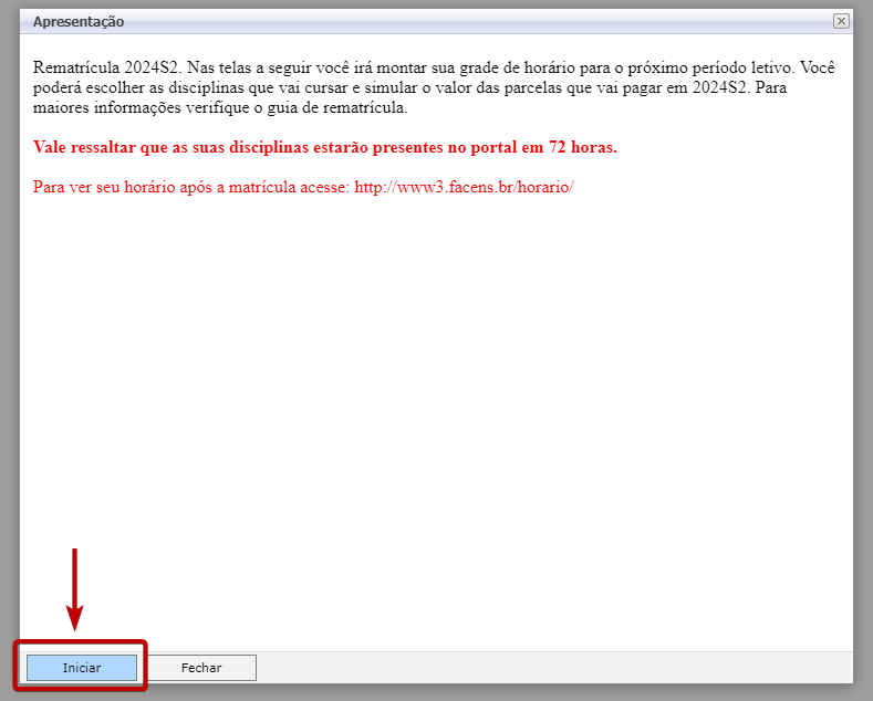Para iniciar a rematrícula clique em Iniciar.