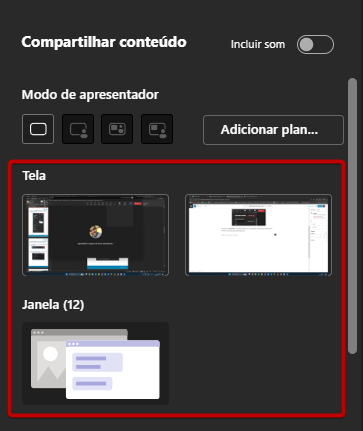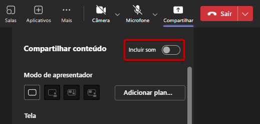 Caso queira compartilhar também o áudio do seu computador, marque a opção Incluir som do computador: