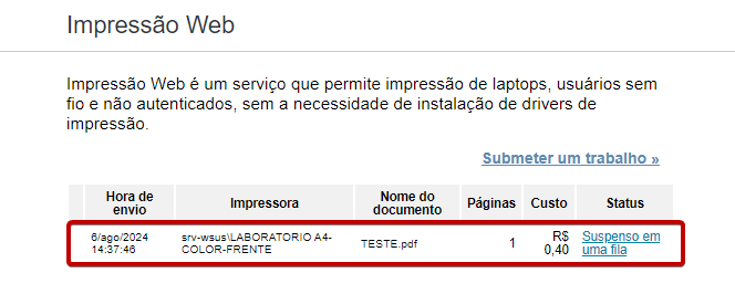 Com o arquivo no status Suspendo em uma fila, compareça ao LI ou Biblioteca (Conforme selecionado no primeiro passo) para liberar a impressão e retirar o arquivo.