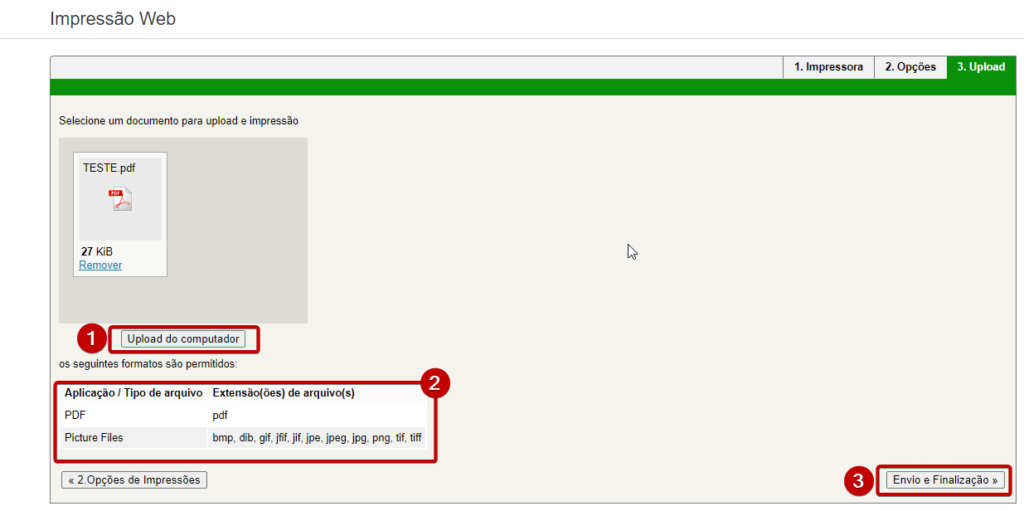 7- Submeta o arquivo em Upload do computador que deseja imprimir e finalize em Envio e Finalização.