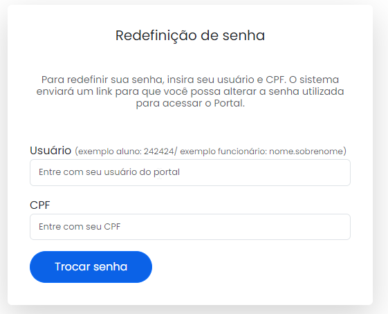 Para redefinir sua senha, insira seu usuário e CPF. O sistema enviará um link para que você possa alterar a senha utilizada para acessar o Portal.